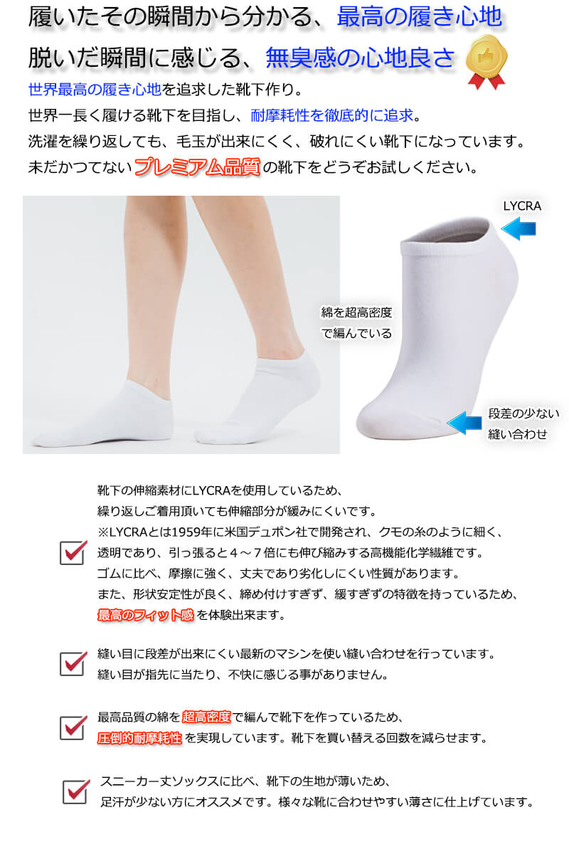 スニーカー丈ソックスに比べ、靴下の生地が薄いため、足汗が少ない方にオススメです。